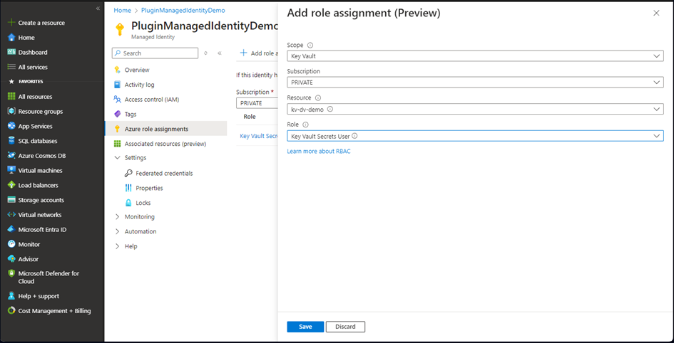 In Azure role assignments section, we have to assign access to particular resource. In our case it is Key Vault with Key Vault Secrets User role.