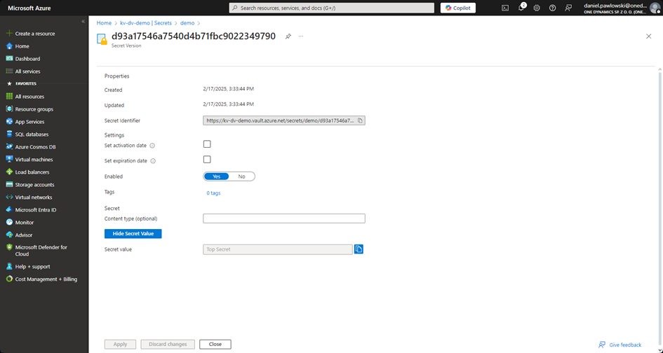 We have our Key Vault set up with the following secret: