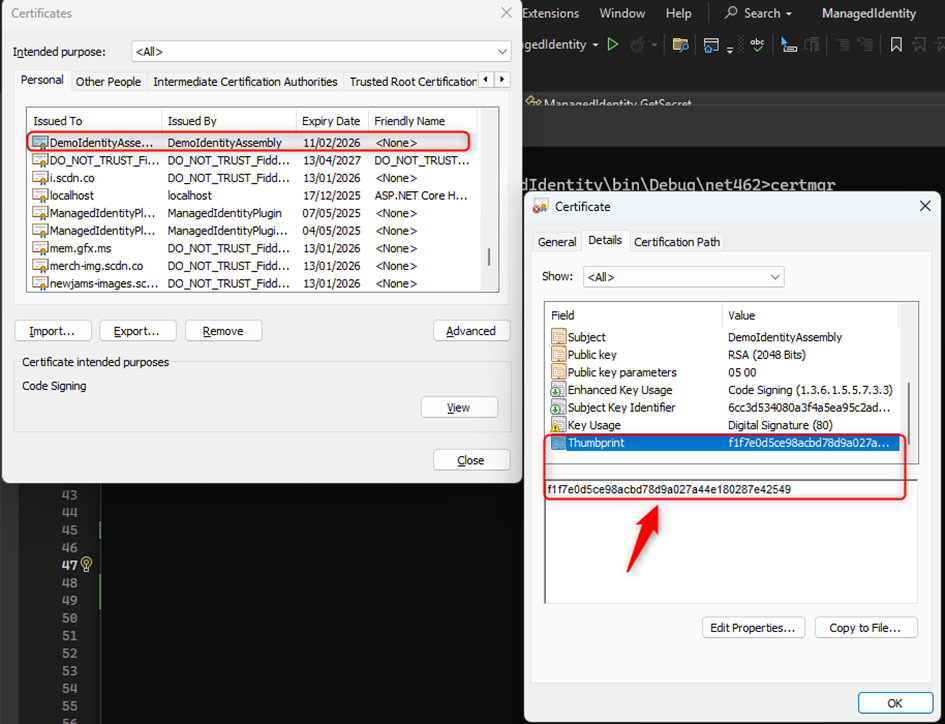 New-SelfSignedCertificate -Type CodeSigningCert -Subject "CN=DemoIdentityAssembly" -CertStoreLocation "Cert:\CurrentUser\My"The certificate will be stored in the Current User store under the name 'DemoIdentityAssembly' (you can customize the name).