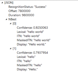 Believe me or not, I actually said “Hello world” when I was making the sound note. So basically the result says that it’s 92,5% sure that I said “Hello world” and 79% that I said “Hello”. There can be more matches of course – how we handle those matches is a different story. We can prepare some sort of machine learning algorithm, maybe use something that’s already there on Azure or maybe some neural network algorithm – whatever you like. I’m simply taking the match with the highest Confidence parameter, I guess that in many cases it will be wrong, but for a PoC it’s good enough for me.