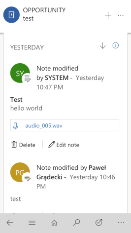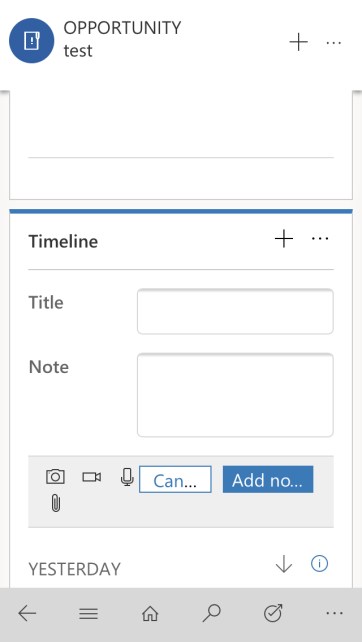 In case you did not notice that yet, Dynamics 365 9.0 ships features that will allow developers to achieve really powerful custom components, working across all D365-supported devices. Unified Interface – as its name suggests – works pretty much the same on all devices, which means that we are no longer sandboxed by some “metadata rebuilding in progress” nightmare (people who used the old mobile app understand what I mean by that). Personally I believe that Custom Control Framework will be something that will really make D365 shine as a modern technology, but so far we don’t know when it would be available (hopefully we will learn something more about it on Extreme 365, so see you there!). Waiting for that big thing I was playing a little bit with the new mobile App. Right now it’s super easy on mobile to add picture, video or recorded audio as an attachment to a record. While adding a note you will see the icons representing each of these: